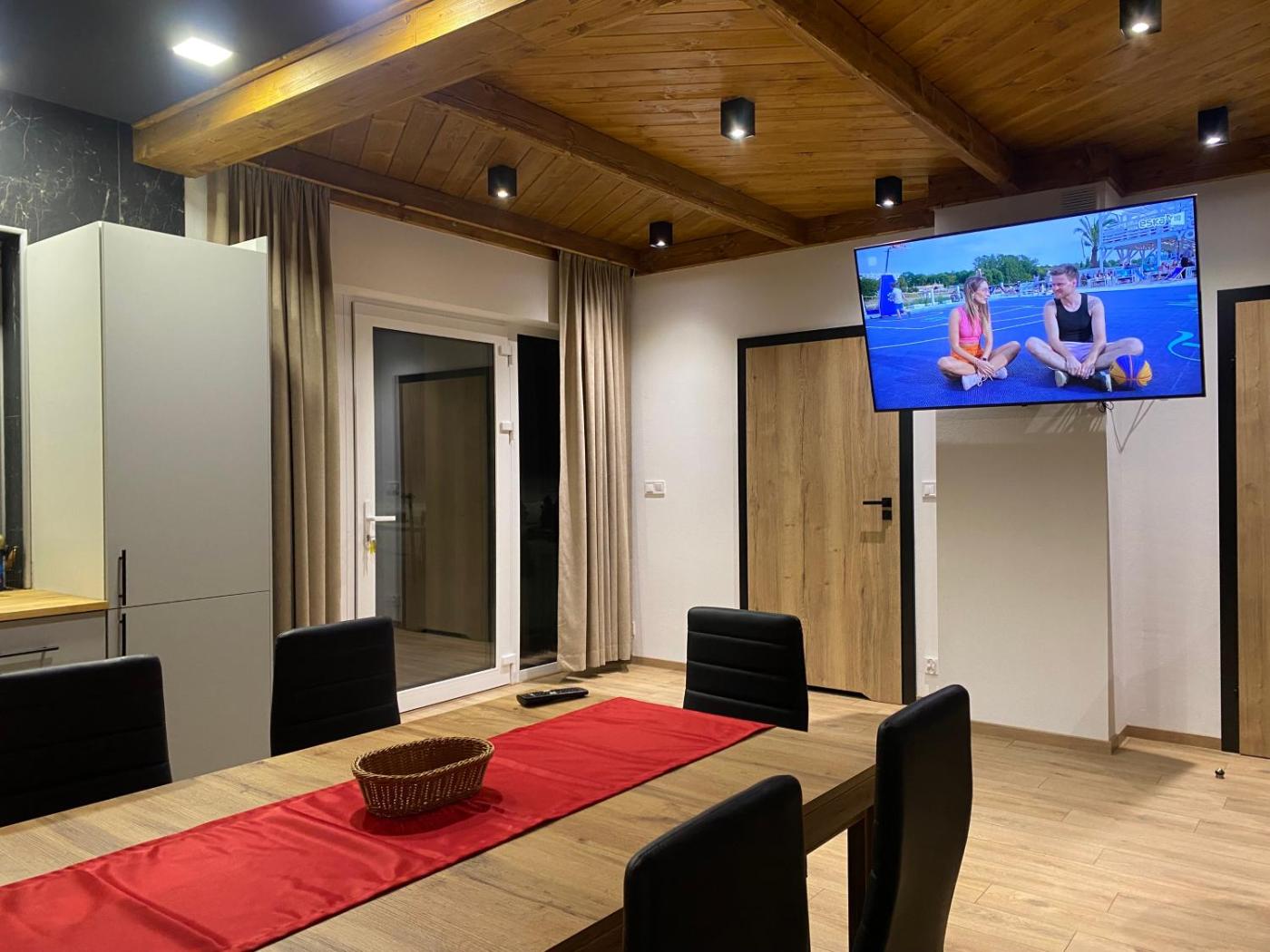 Two-Bedroom House - 6F. Boasting a private entrance, this holiday home includes 1 living room, 2 separate bedrooms and 2 bathrooms with a walk-in shower and a bidet. Meals can be prepared in the kitchen, which is fitted with a stovetop, a refrigerator, a dishwasher and kitchenware. The unit has a washing machine, garden views, a terrace and winechampagne is offered for guests. The unit has 4 beds. Dom wakacyjny - 5 osobowy. Powierzchnia pokoju ok.: 100 mkw.